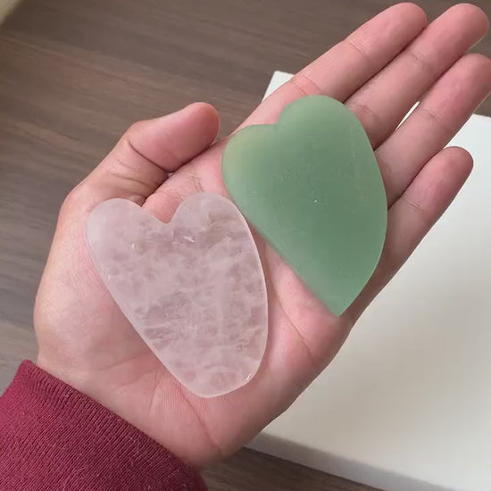 Apply the healing emergies of the natural gemstone of Rose Quartz and Green Mica with this free form gua sha face massage tool.