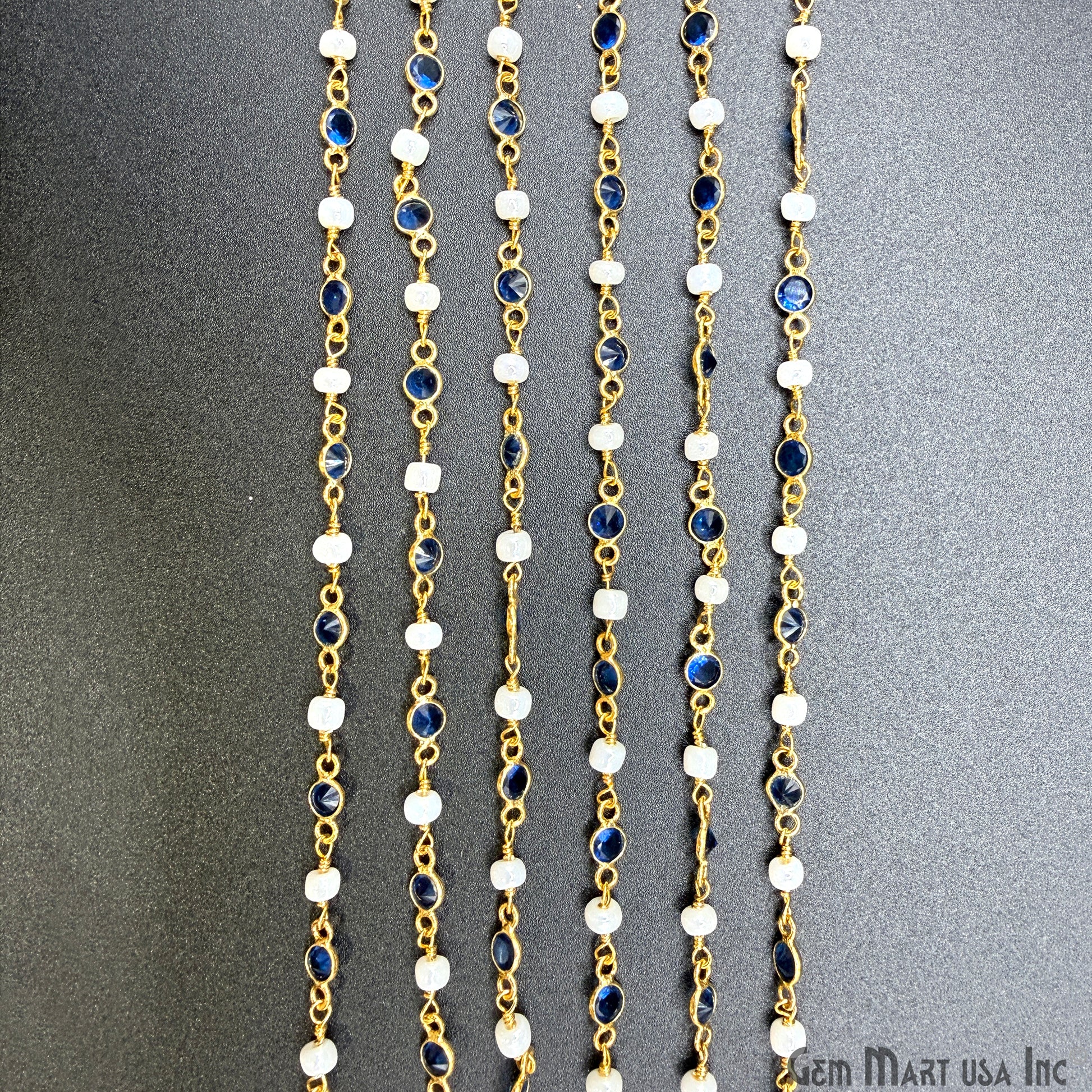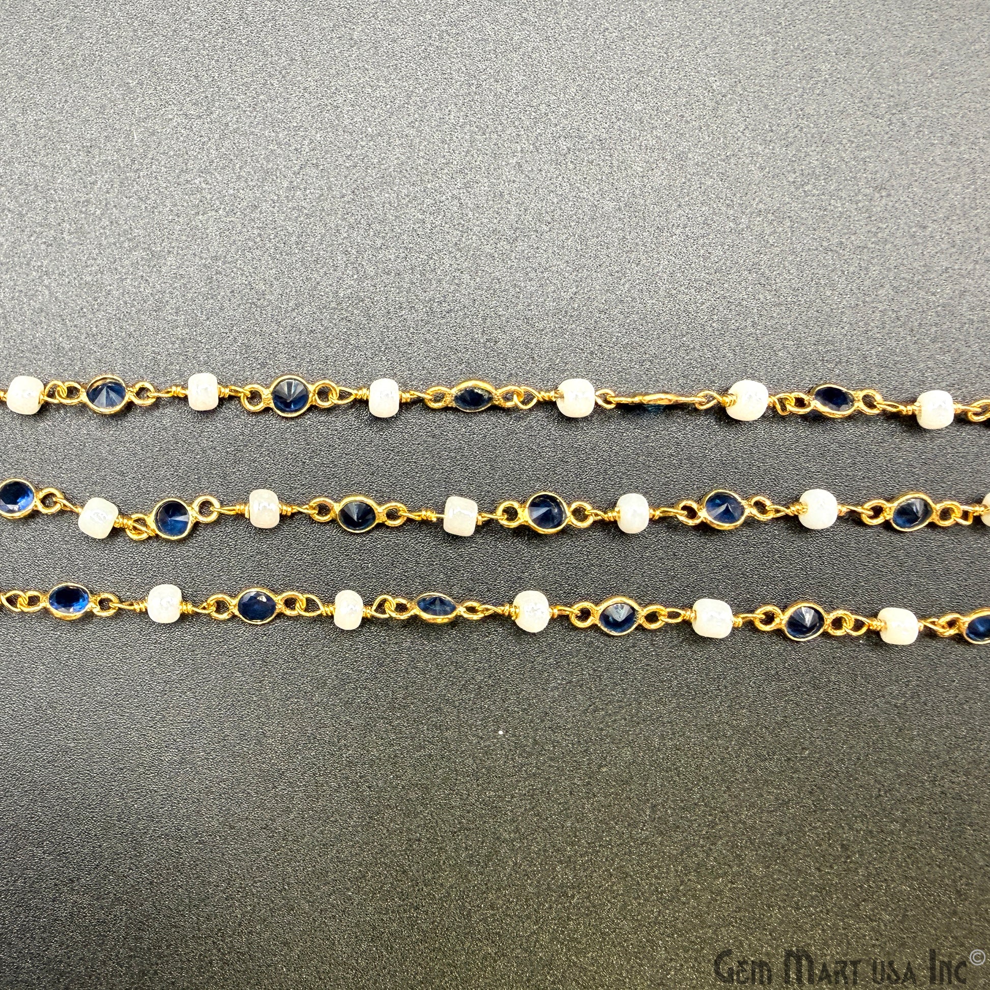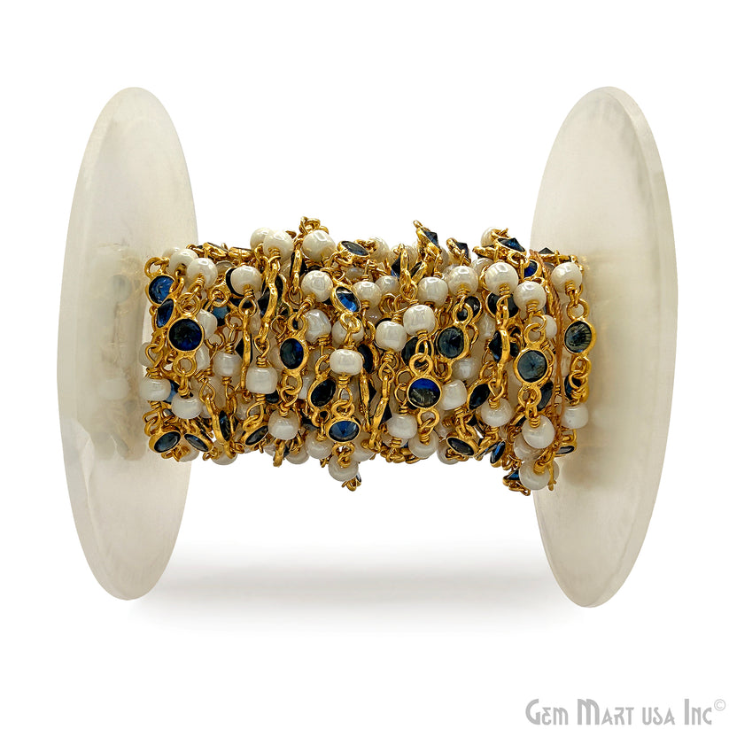 Sapphire & Pearl Beads Gold Plated Round Shape Bezel Link Continuous Connector Chain